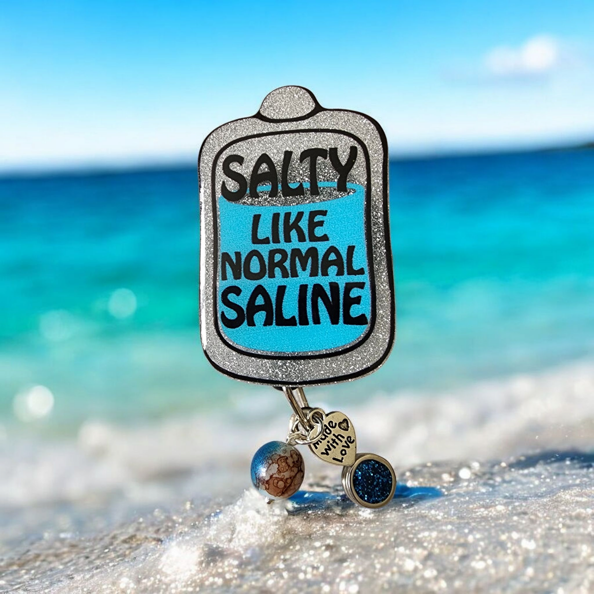 "SALTY LIKE NORMAL SALINE" handmade acrylic badge reel. Alligator clip attachment. Beads and or charms attached.