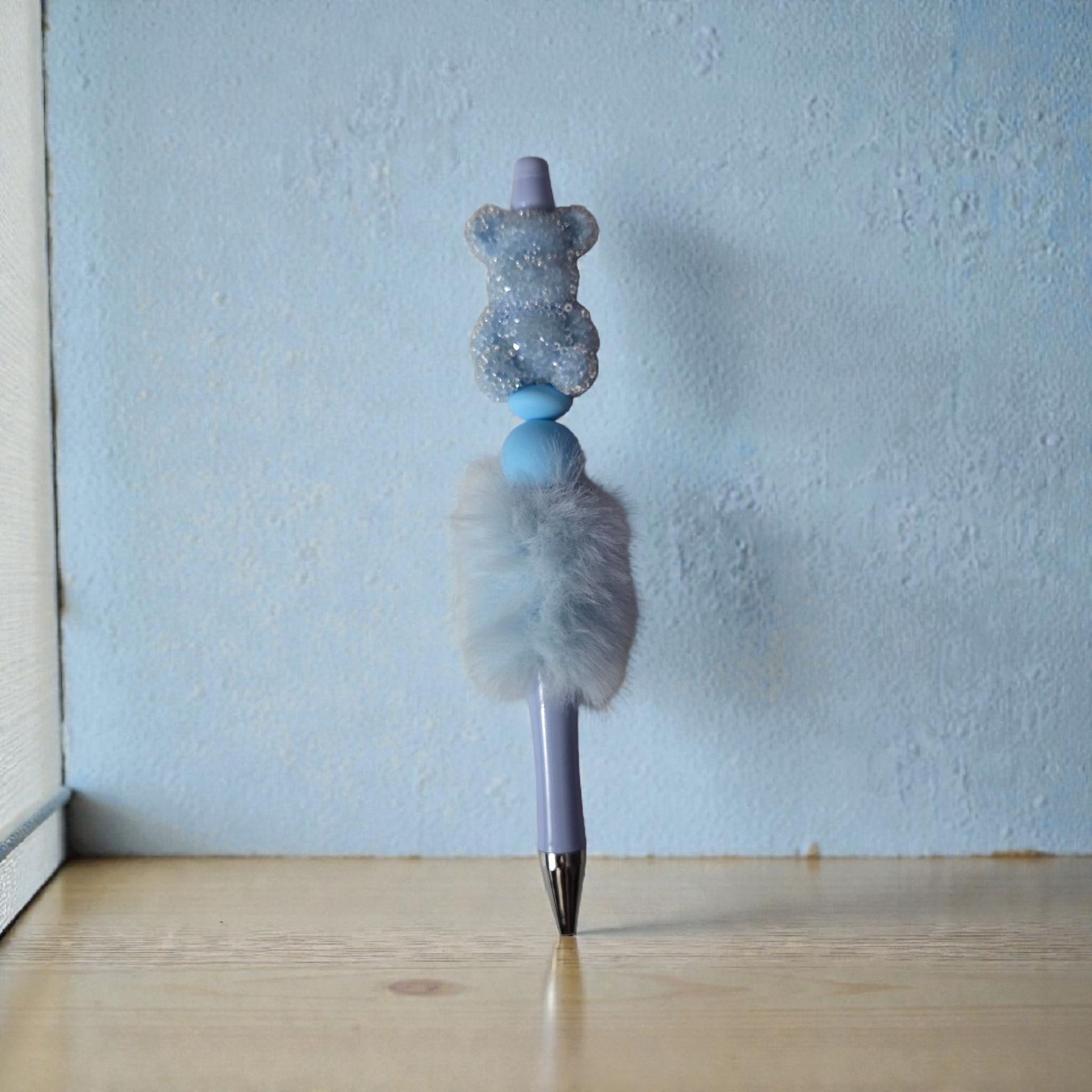 Cute Blue Beaded Pen. Blue Bear Sugar Bead and a Blue Fluffy Bead. Also Silicone Beads. So much fun! Black Ink. Extra Ink Refill Included.