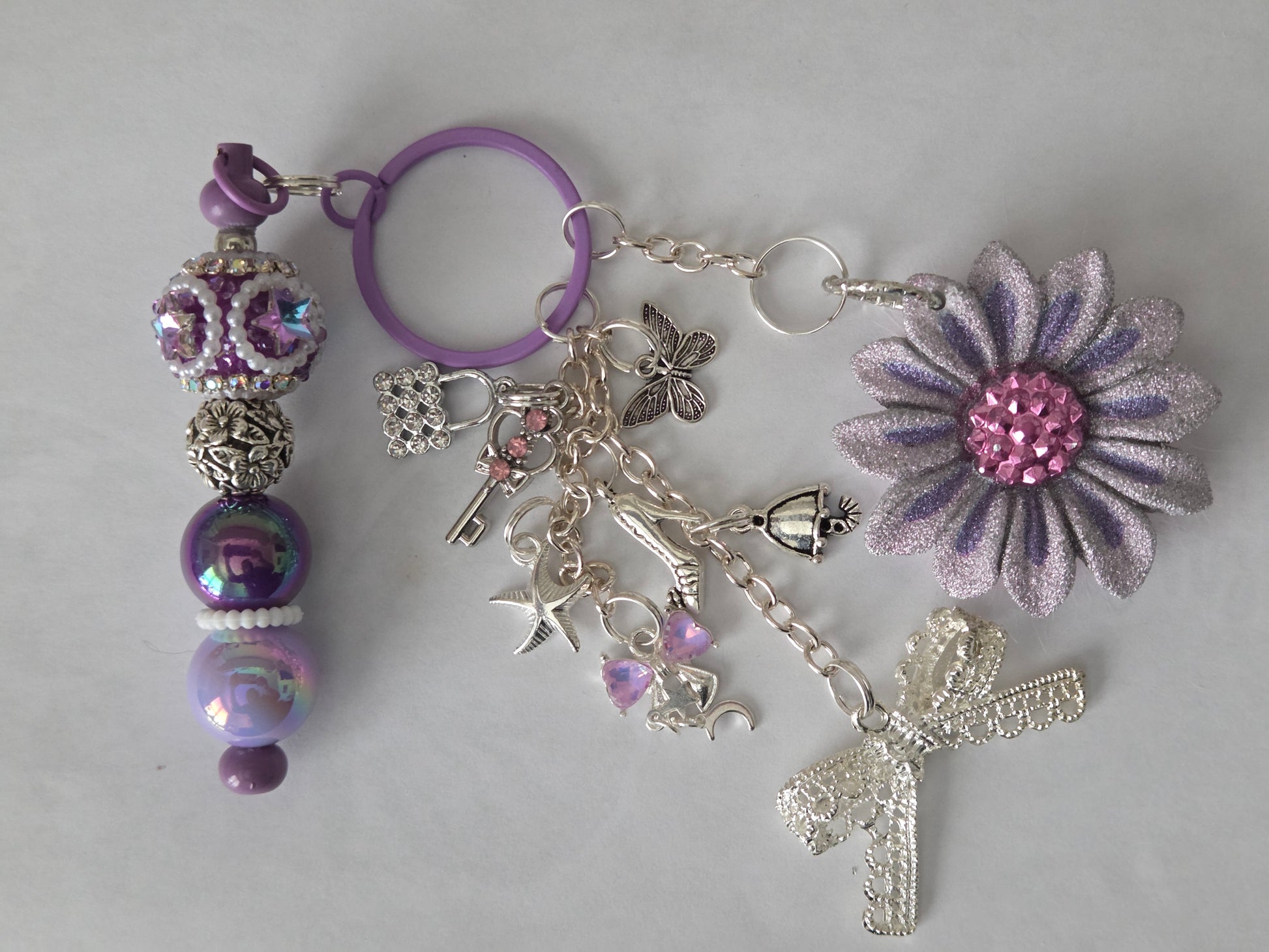 Purple in color. Loads of Silvertone Charms. Metal Keyring. Acrylic Beads.