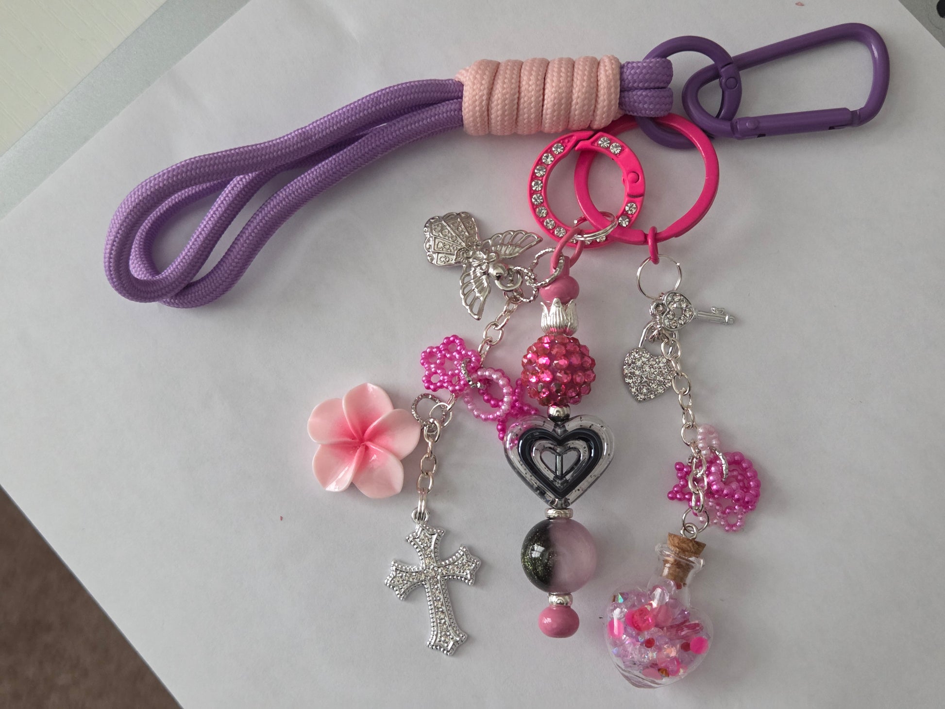 Pink & Purple Tones. Acrylic Beads. Lots of Silvertone Charms. Metal Keyring.