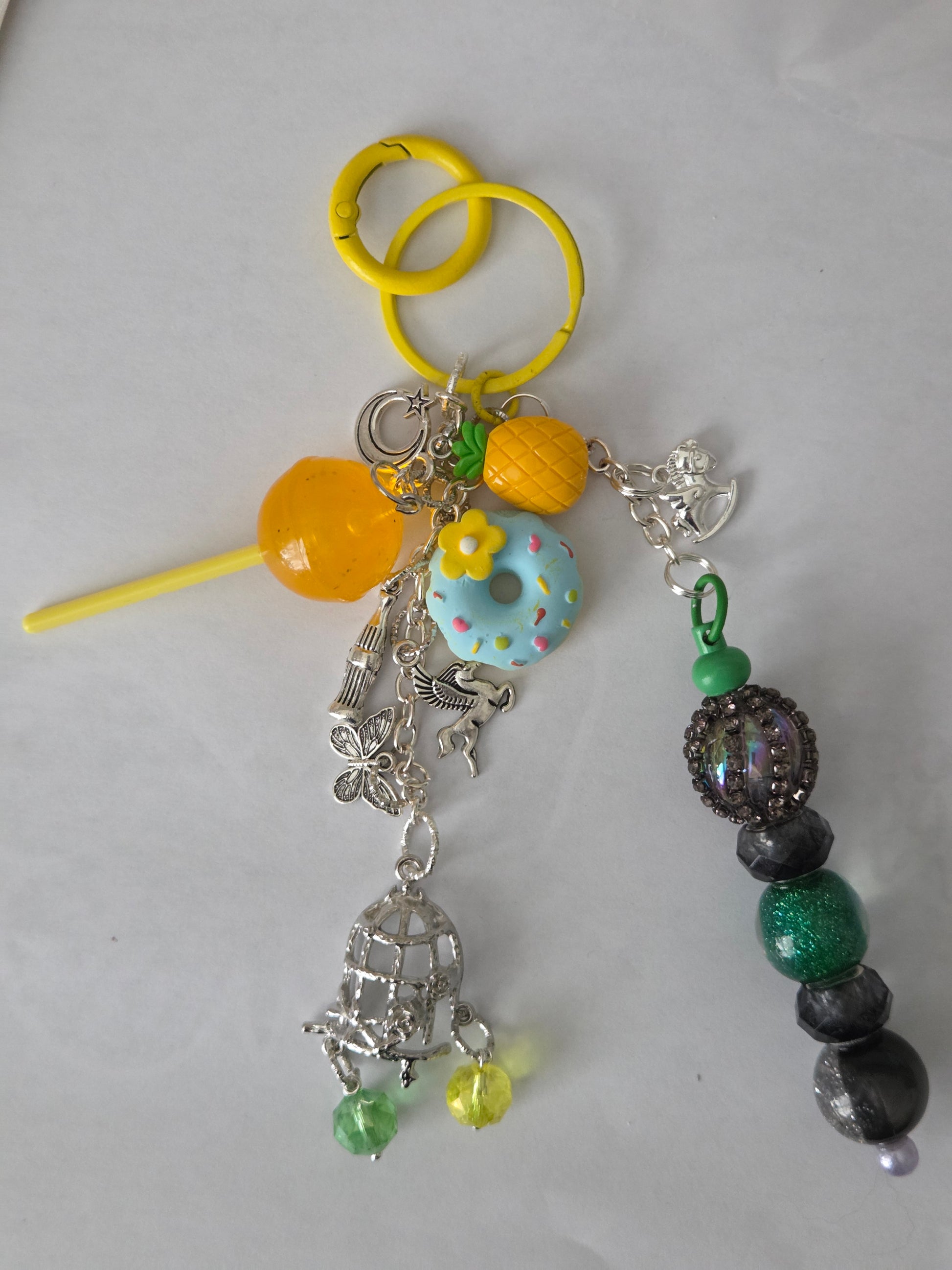 Such aFun Keychain. Yellow and Green Colors. All kinds of fun charms. Some metal,some acrylic. Acrylic Beads.