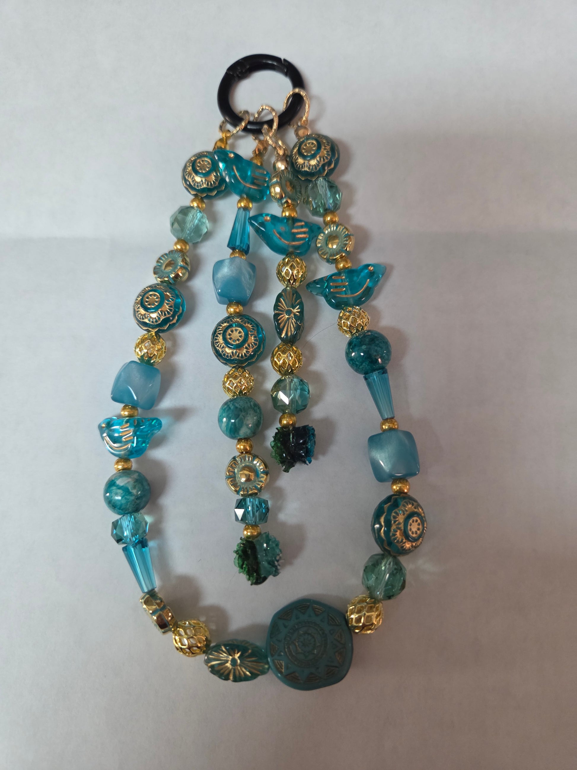 Beautiful tones of green and gold. Acrylic and Glass Beads. Phone Charm Attachment Included.
